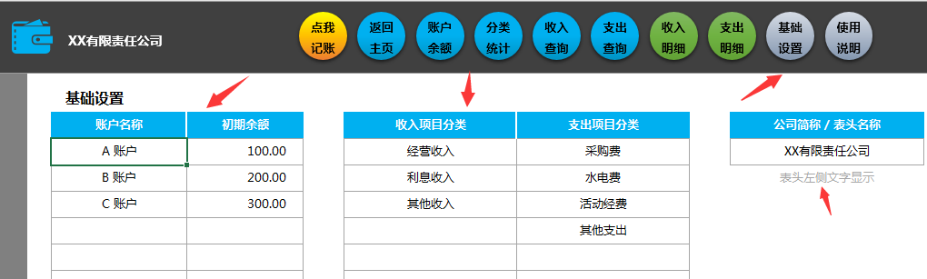 先录入基础信息,账户,项目,期初信息等,方便其他表单下拉菜单选择。