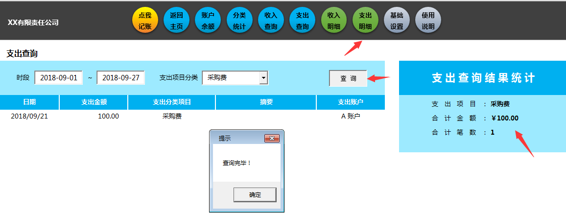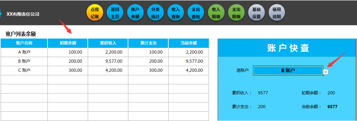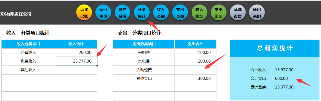 分类汇总收支表自动生成,右侧选择,自动显示。