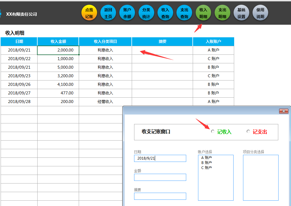 记账录入保存后,自动统计到收入明细表中。