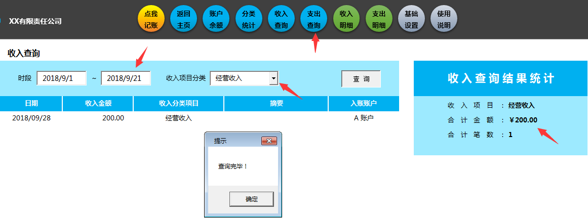 收入查询表,选择时间区间,选择项目,自动显示结果。