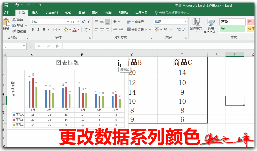 1)选中图表,点击出现的“图表工具”选项卡下面的“设计”选项卡,点击“图表样式”栏的“更改颜色”按钮,在弹出的菜单中选择所需的颜色即可。