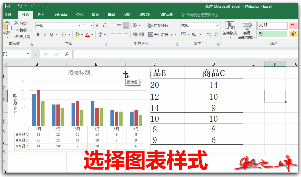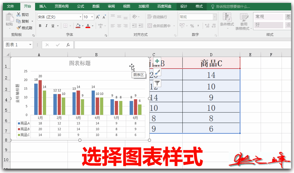 2)选中图表,点击图表右侧的“图表样式”悬浮按钮,在弹出菜单中点击需要的图表样式即可。