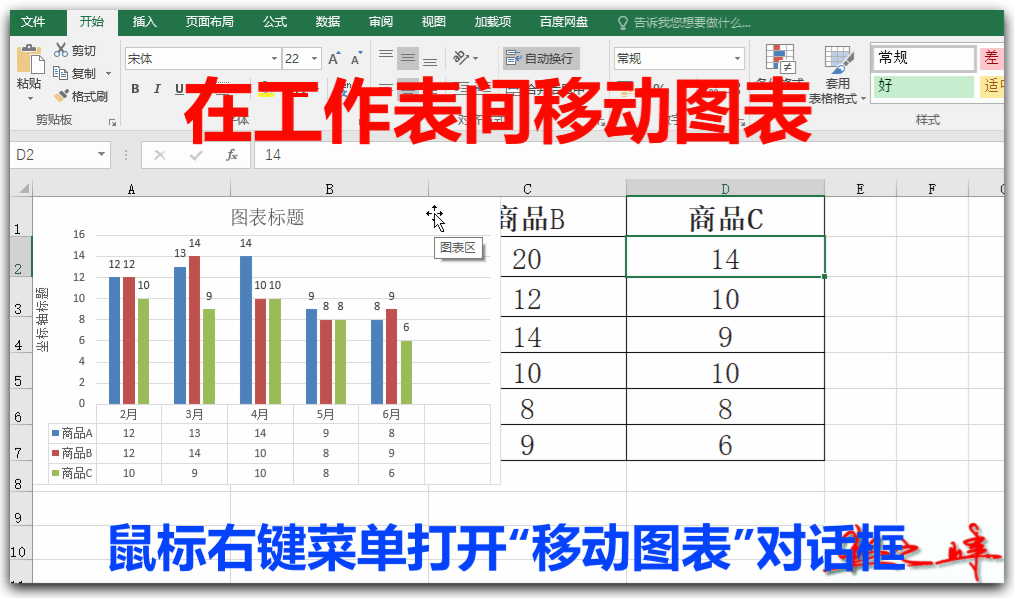 1)鼠标右键单击“图表区”空白处,在弹出的菜单中选择“移动图表”;