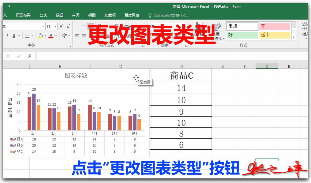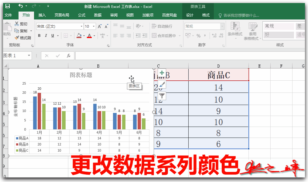 1)点击选中图表,在出现的“图表工具”选项卡下面的“设计”选项卡上,点击“切换行/列”按钮;