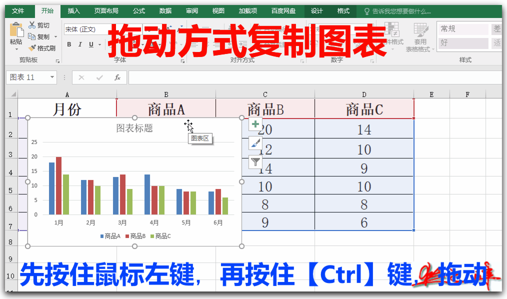 2)将鼠标放到“图表区”容器框上,当鼠标指针变成十字箭形时,按住鼠标左键,再按住【Ctrl】键,将图表拖到需要的位置即可。