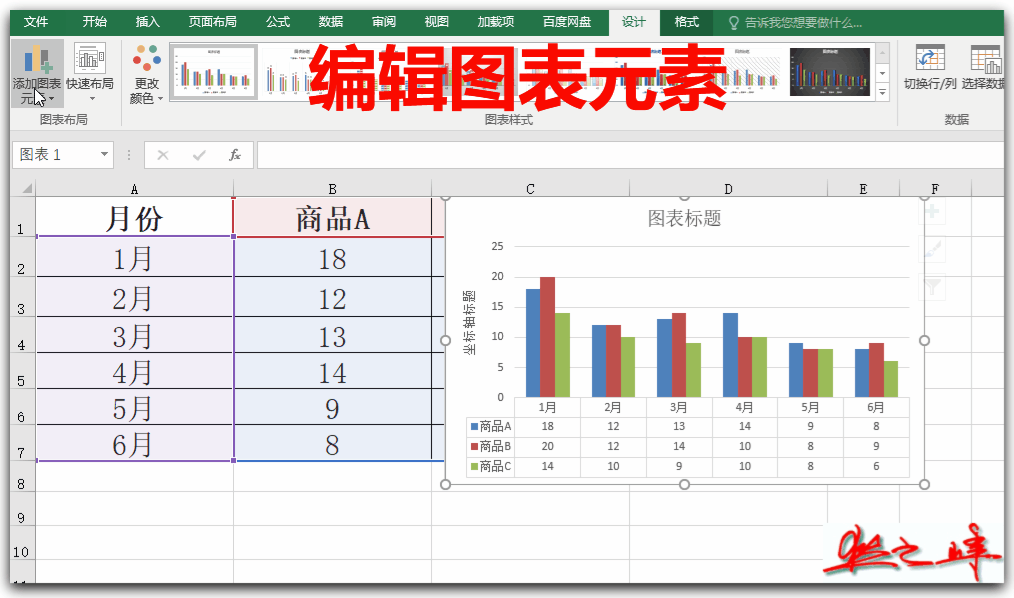 1)点击选中图表,在出现的“图表工具”选项卡下面的“设计”选项卡上,点击“添加图表元素”按钮,在下拉菜单中根据需要勾选或取消相应元素即可。