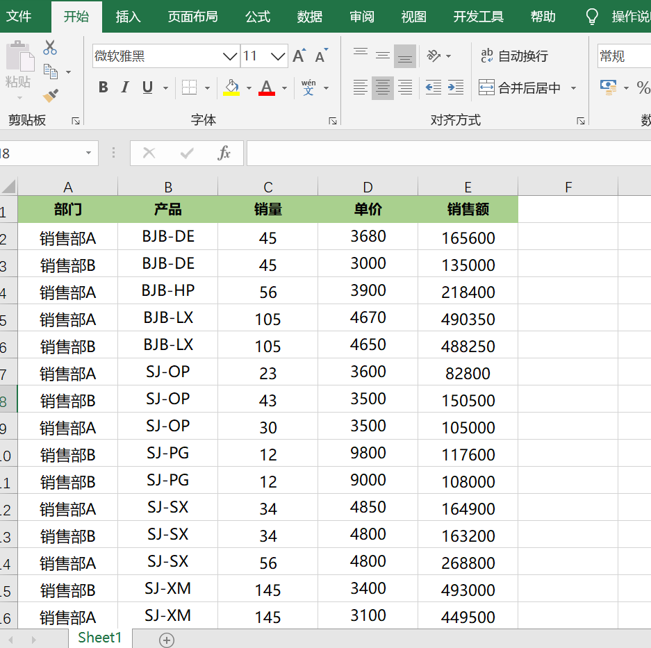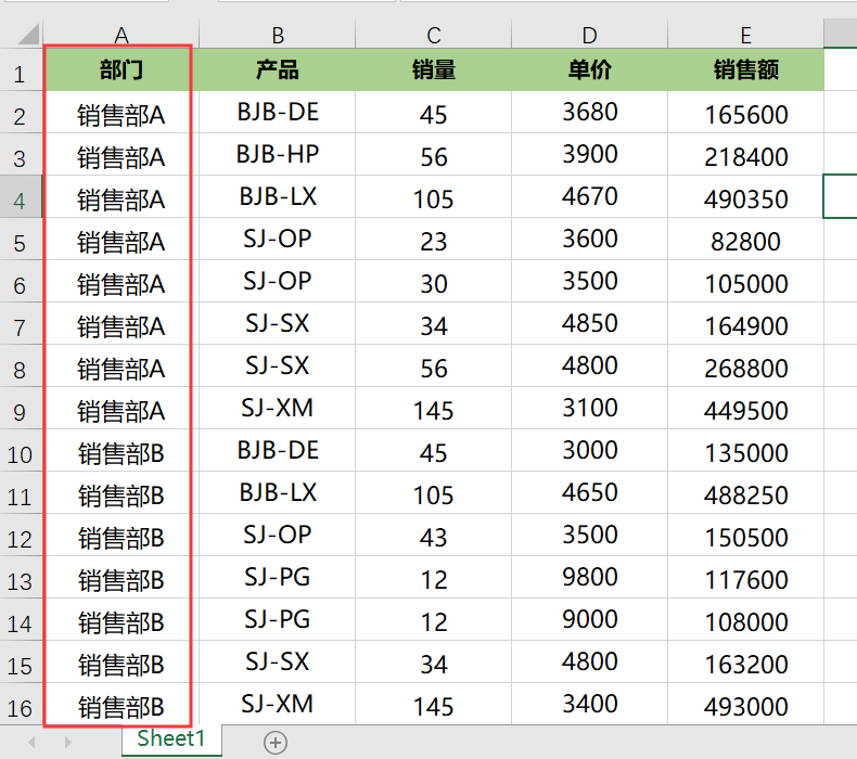 我们需要对数据表中部门数据进行汇总,首先需要对部分的数据进行排序,如下图:
