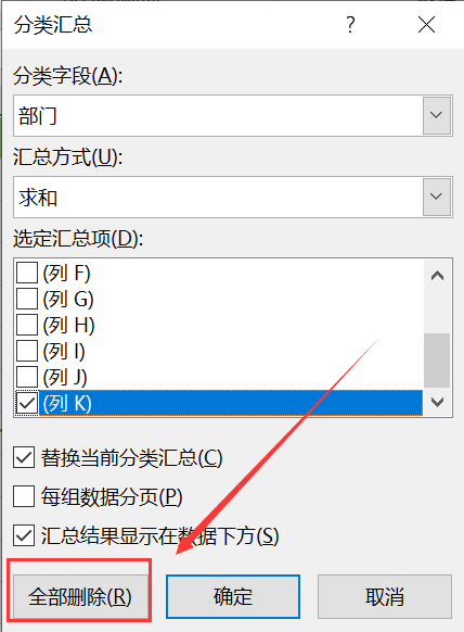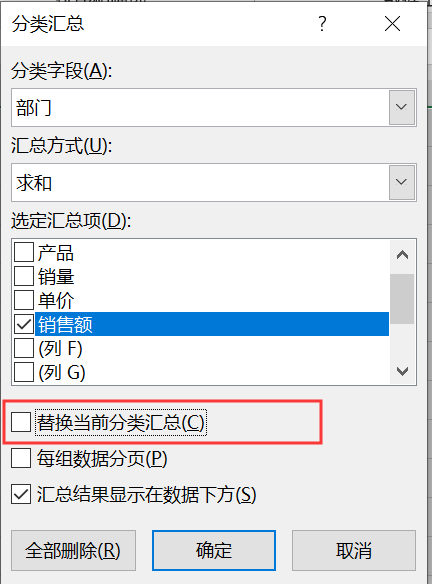 还是选中数据,对其进行分类汇总,先对部门数据进行分类汇总,这里注意需要把【替换当前分类汇总】的勾选取消;
