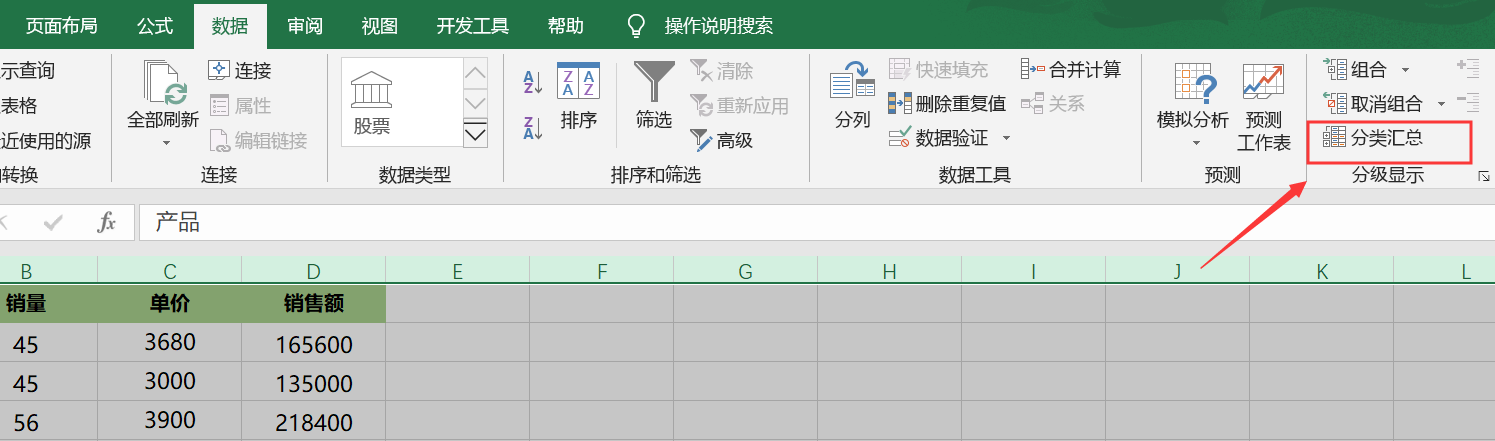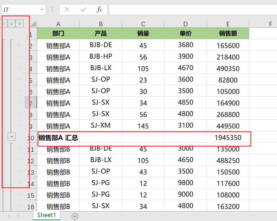 然后在部门分类汇总后数据的基础上,再做同样的操作对产品数据进行分类汇总;分类汇总后的数据如下图: