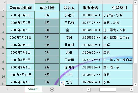 如果输入的内容只是日期中的某一部分,例如只有月份,Excel 也会智能地将其他单元格中的相应组成部分提取出来生成填充内容,如下图所示。
