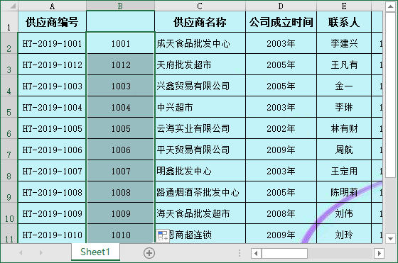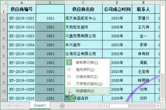 快速填充功能是Excel 中非常智能的一个数据填充功能,它可以根据当前输入的一组或多组数据,参考前一列或后一列中的数据来智能识别数据的规律,然后按照规律进行数据填充,大大减少了用户的操作,提高了工作效率。