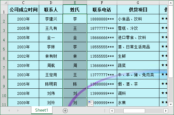 如果在单元格中输入的不是数据列表中某个单元格的完整内容,而只是其中字符串中的一部分字符,那么Excel 会依据这部分字符在整个字符串中所处的位置,在向下填充的过程中按照这个位置规律自动拆分其他同列单元格的字符串,生成相应的填充内容。如下图所示。