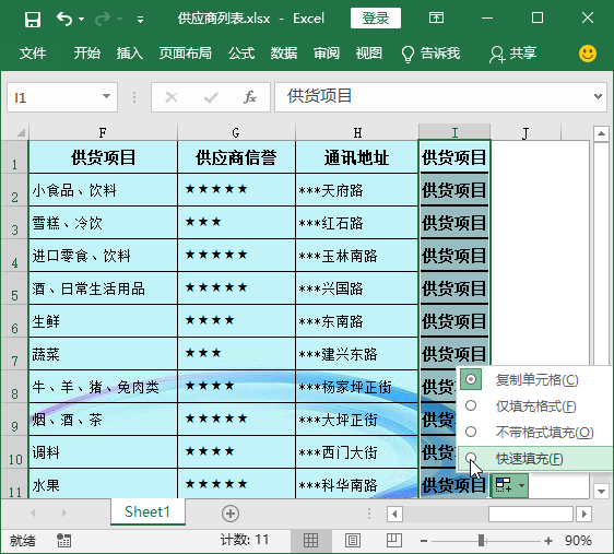 在单元格中输入相邻数据列表中与当前单元格位于同一行的某个单元格内容,然后在向下快速填充时会自动按照这个对应字段的整列顺序来进行匹配式填充。如下图所示为选择"快速填充"选项。