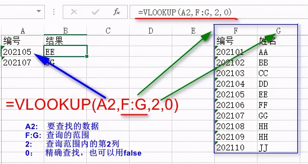 =VLOOKUP(A2,F:G,2,0)