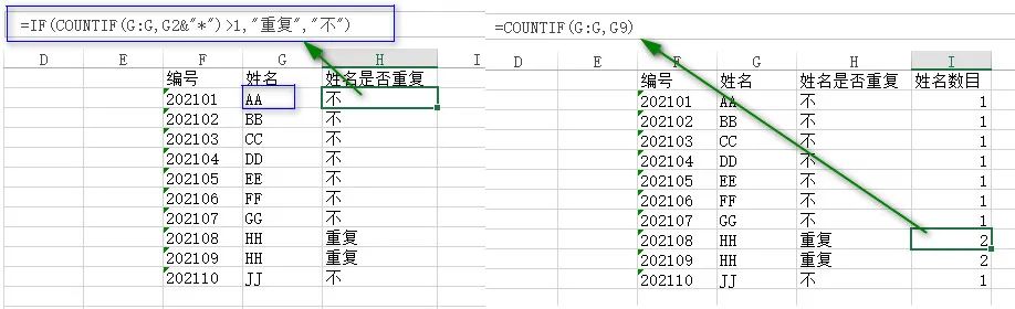 =IF(COUNTIF(G:G,G2&"*")>1,"重复","不")