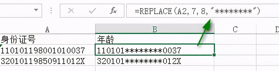 =REPLACE(B2,7,8,"****")
