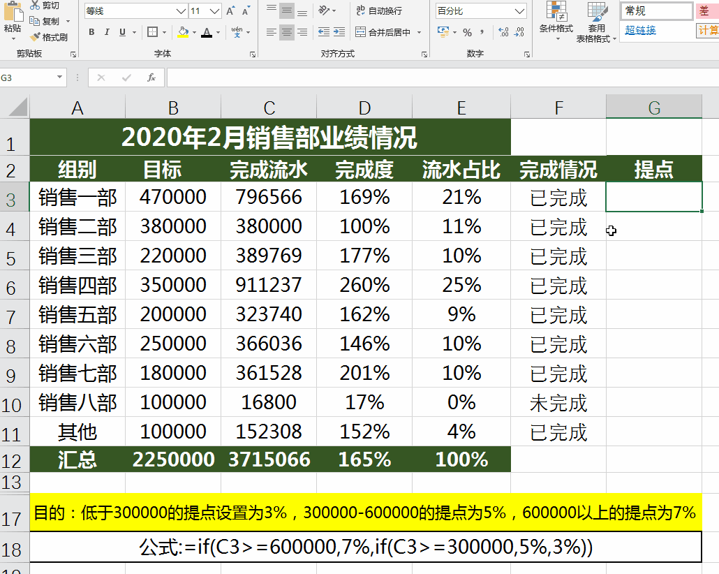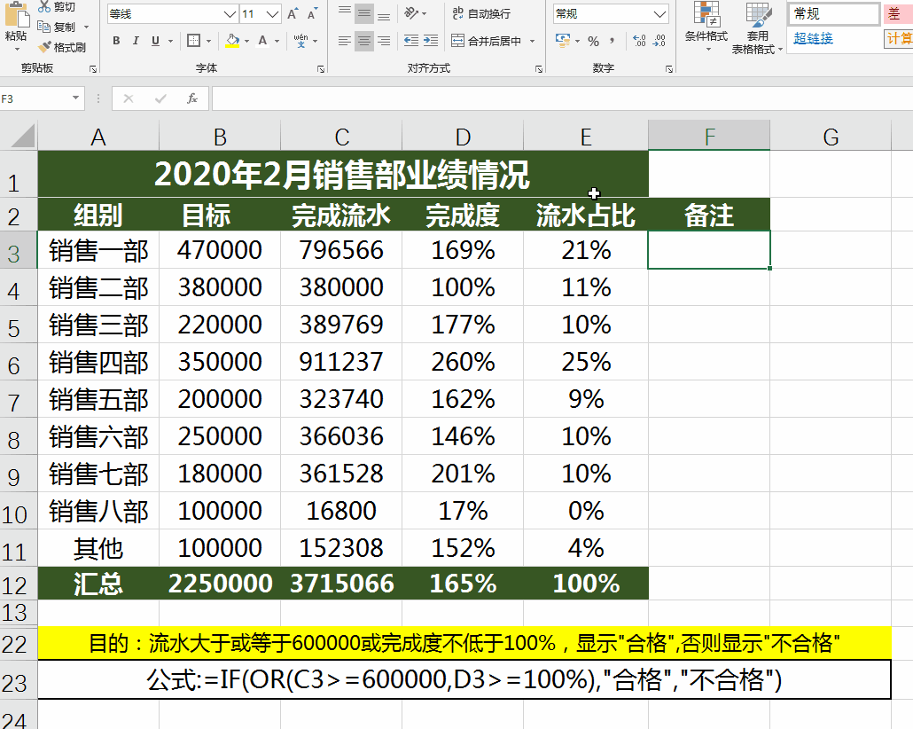 目的:流水大于或等于600000或完成度不低于100%,显示"合格",否则显示"不合格"
