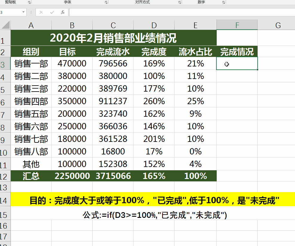 =if(D3>=100%,"已完成","未完成")