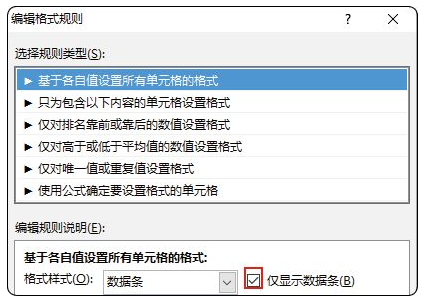 上图如果只想显示数据条,不显示数字,在编辑格式规则时在“仅显示数据条”前面方框内打钩,如下图所示。