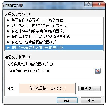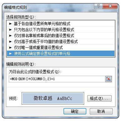函数ROW返回行号,COLUMN返回列号,MOD是两数相除求余数,该条件格式的公式用于判断行号与列号之和除以2的余数是否为0。