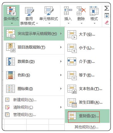 如果需要查找某数据区域是否存在重复值,将重复值醒目标识,单击条件格式→突出显示单元格规则→重复值,设置为自己想要的格式,如下图所示。