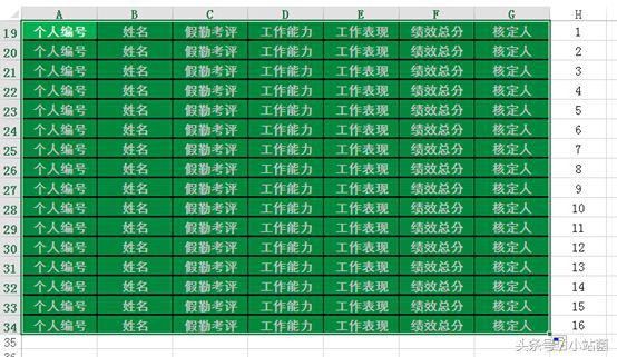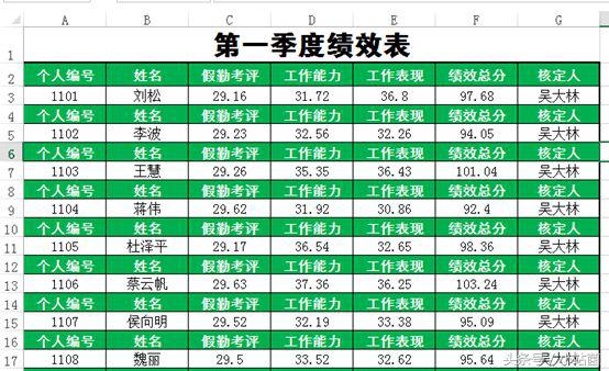 有时候我们可能会将工资条、考核表等数据分别发放到每个人手里,那么就需要将表格做成如下图所示的形式。