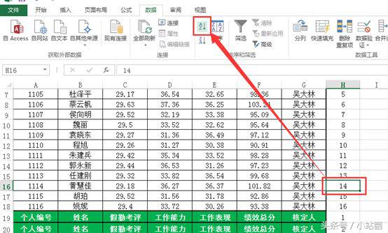 在H列中任意数据区域上单击鼠标,在“数据”选项卡中单击“升序”按钮。