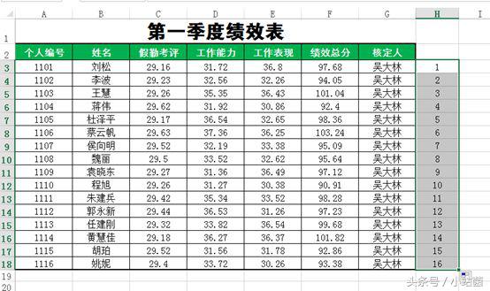 将表头A2:G2的文本分别复制到A19:G34单元格区域,并在H19:H34单元格区域中复制H3:H18的数据。