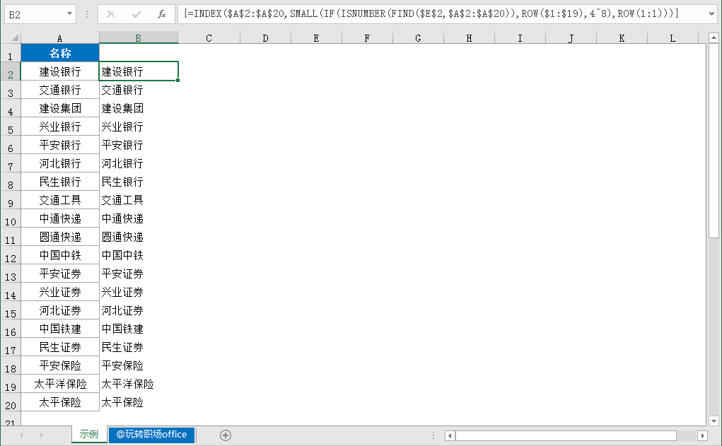 =INDEX($A$2:$A$20,SMALL(IF(ISNUMBER(FIND($E$2,$A$2:$A$20)),ROW($1:$19),4^8),ROW(1:1)))
