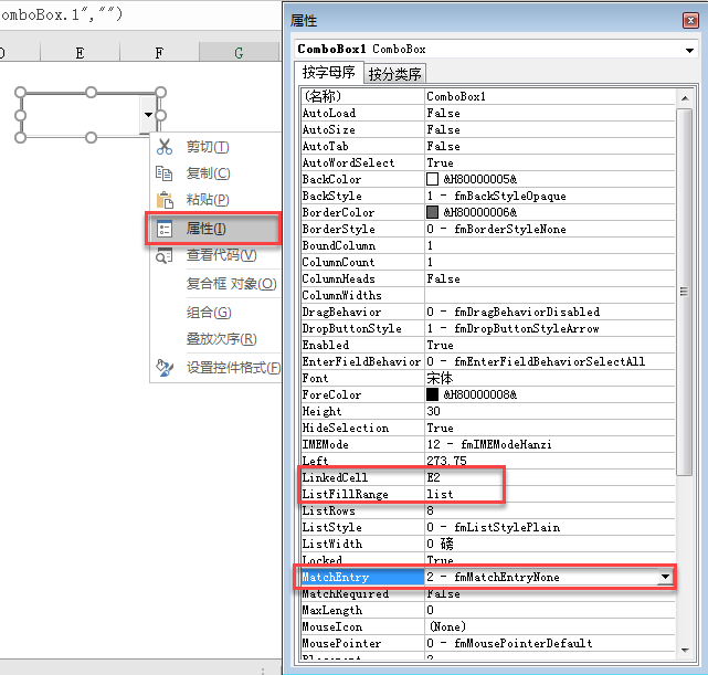 LinkedCell文本框中输入E2,这个是代表E2单元格,在控件中输入的内容会返回到E2单元格,在第一步的公式中通过判断E2单元格的内容来提取符合的名称。