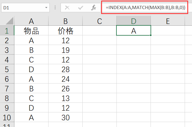 最高的价格是30,那么对应的商品是什么,方法很多,这里采用一个经典的INDEX+MATCH组合的方法,使用公式: