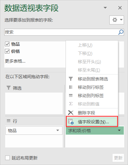 选中数据,插入数据透视表,然后,将物品拖入至行标签,将价格拖入至值