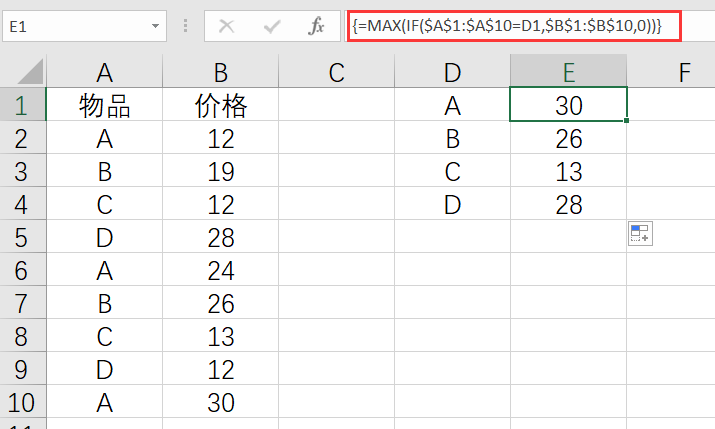 如果需要求各种物品的最高价格,那就需要把数据区域绝对引用,输入完一个公式之后,向下填充