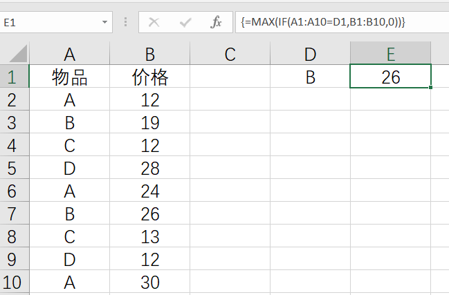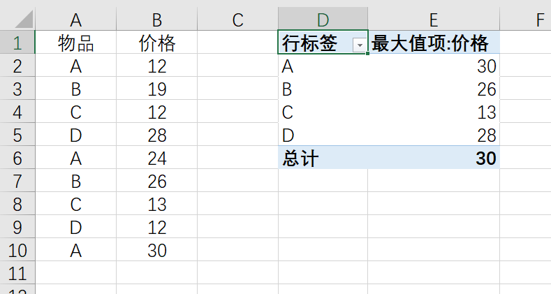 当然如果是求各种商品的最大价格,我们可以用数据透视表的方法来解决