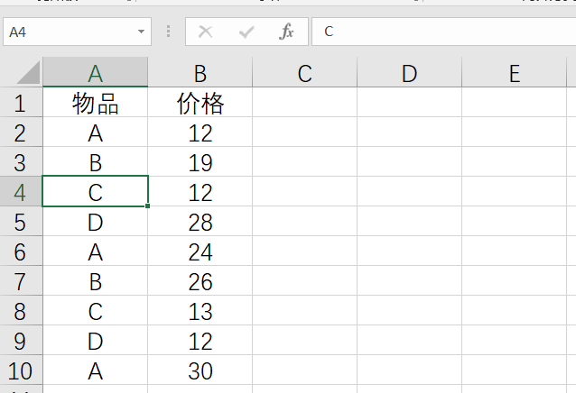 今天我们来探讨几个轻松的技巧,现在有一份数据,A列是各种商品,B列是各种商品对应的价格情况,因时间的不同,每种商品有不同的好几个价格