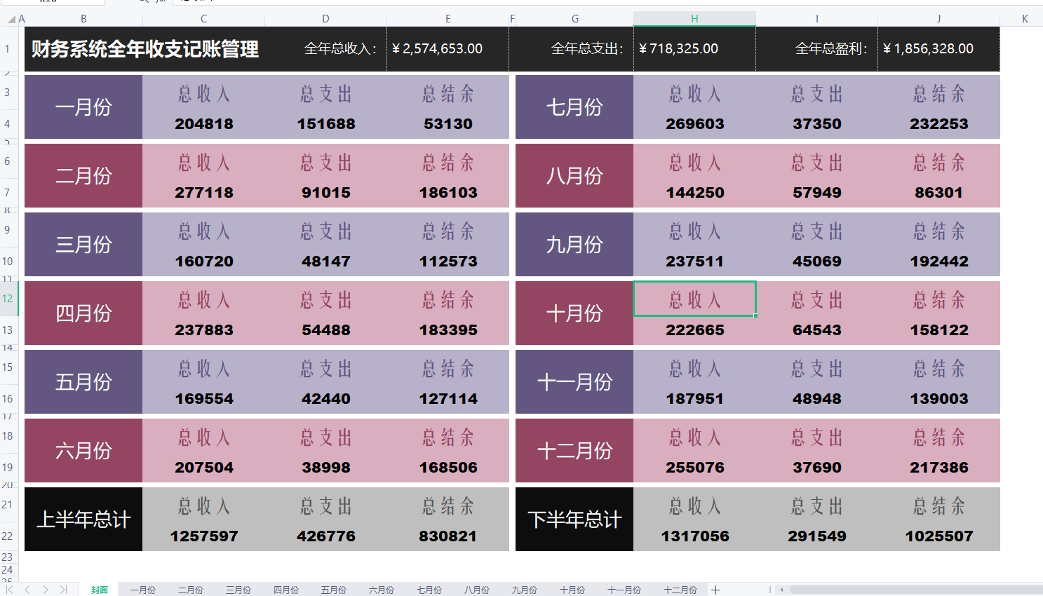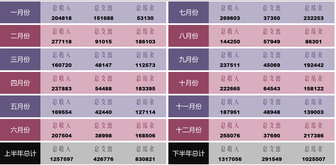 我们再看看数据暂时区域,模板会根据每月输入的数据自动统计每月的收入、支出、盈余情况,也会统计出上半年和下半年分别的收入支出盈利情况。(图3)