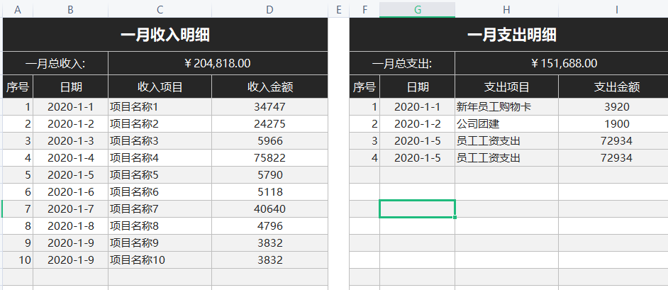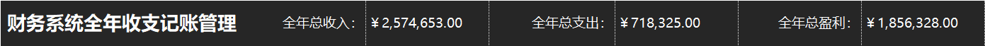 我们首先来看表头部分,模板会自动统计全年的收入、支出,和盈利情况(图2)
