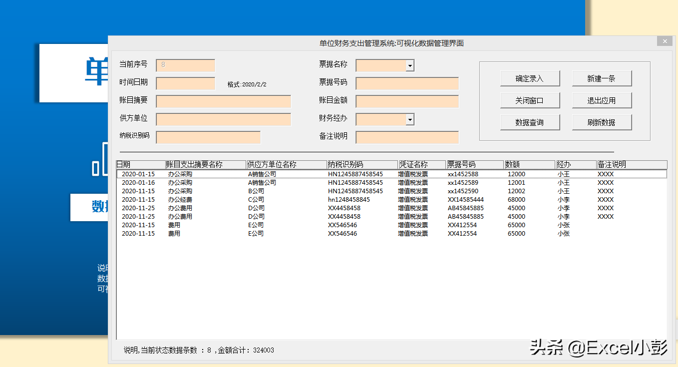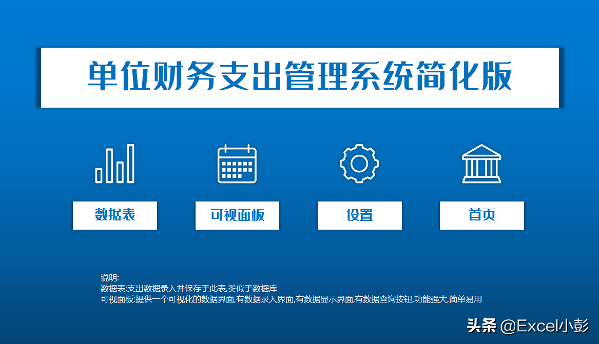 数据工作表主要是用来记录日常财务账目的数据库,至少是类似于access的数据库.标题主要包含日期,账目支出摘要名称,供方单位名称,纳税识别码,凭证票据名称,票据号码,金额,财务经办,备注等几项.可以满足日常记账的需要.