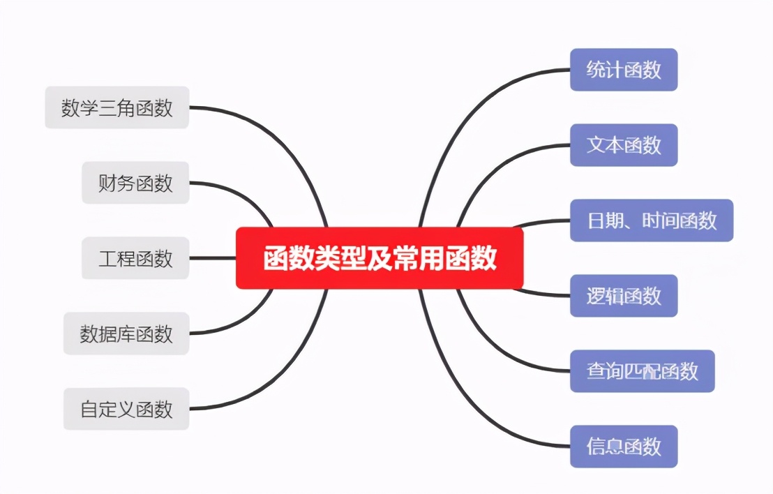 2)函数类型及常用函数,主要为以下11类函数,其中常用函数有6类(右侧)如下图所示: