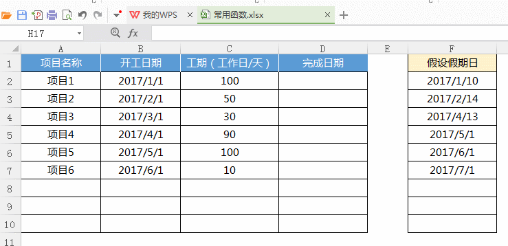 ▲举例:根据项目开始日期及需要的工作天数,预算完工日期。