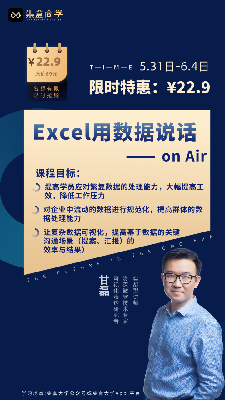 2.报名1门exel线上课程,推荐集盒商学中《Excel效率必修课》,除了上述这些小case还有更多的高级操作,透视图的应用、质量表的制作使用等,还有很多GIF图难以表现清晰的用法,都在 集盒商学 甘磊老师 Excel用数据说话onAir课程中。