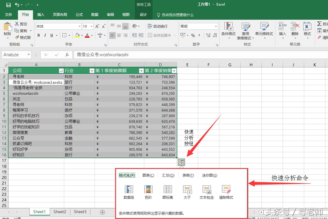 可以看到,快速分析的命令不仅强大而且方便,不过并非所有的Excel软件都包含这一功能,寻老师给大家展示的是微软的Excel 2016,如果低版本的Excel建议大家升级到Office2016再试。