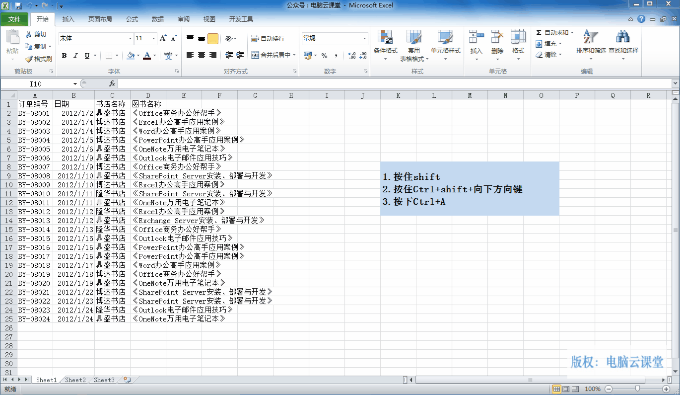 比如我们想选择整列中包含数据的内容,我们可以先在整列的第一个单元格单击一下,然后按住shift,在整列中最后一个包含数据的单元格再单击一下,这样整列中包含数据的内容就被我们选中了,如果我们想选中工作表中所有的数据内容,有两种方法,第一种方法,我们可以先选中前几行数据,然后我们按下键盘上的ctrl+shift+向下的方向键,就可以选中所有的数据了;第二种方法,我们先单击下数据区域中的任一单元格,然后我们再按下Ctrl+A键,这样就可以选中所有的数据区域了,具体操作如下图