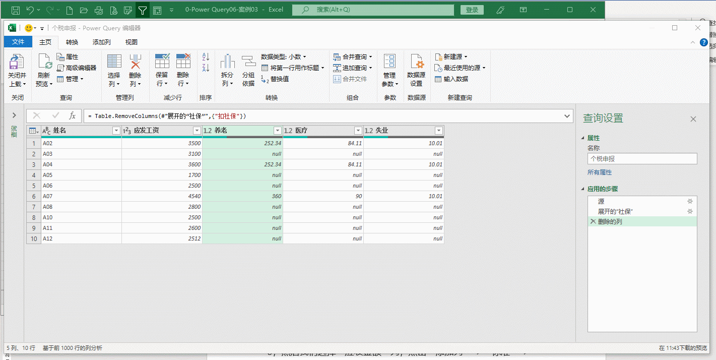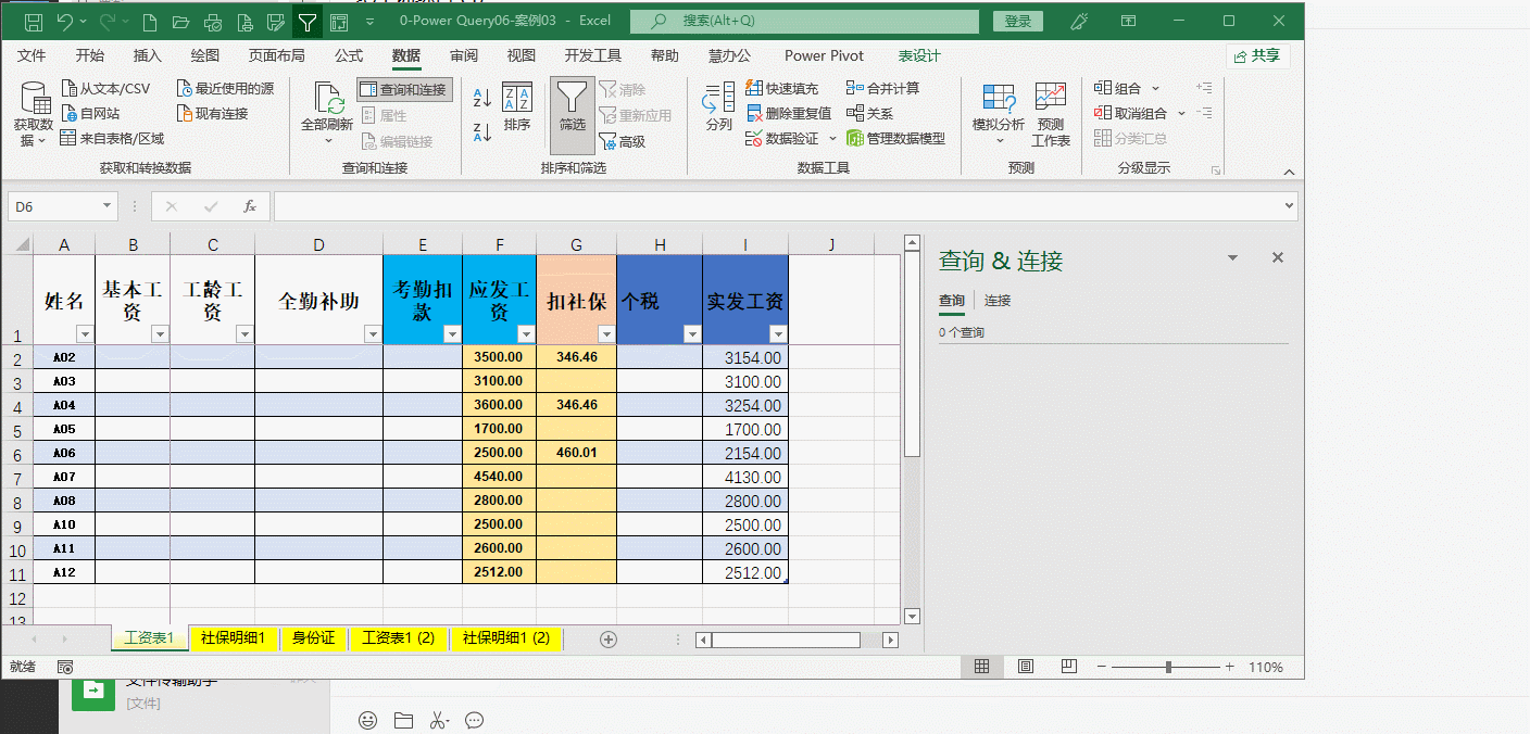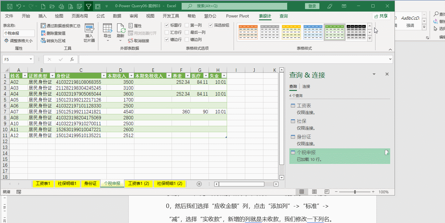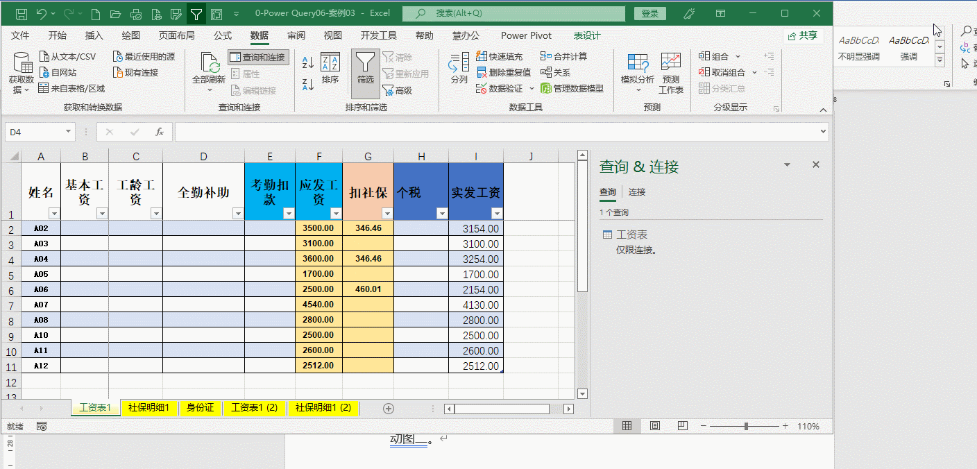 将“基本工资”到“应发工资”之前的列都删除掉,将“个税”列“实发工资”列也删除掉。“关闭并上载至”->“关闭并上载至”->“仅创建连接”,动图一。