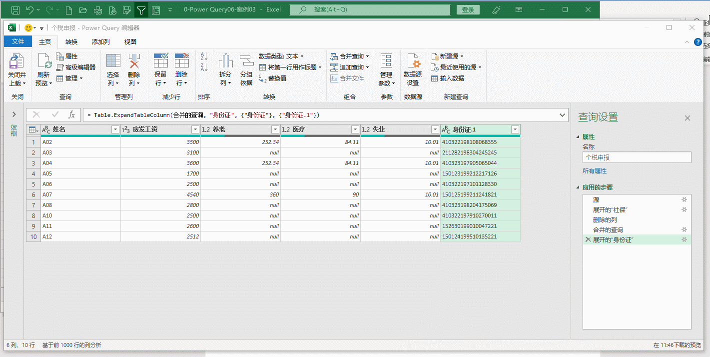 第五步、点击“主页”选项卡下的“合并查询”,第二个查询选择“身份证”,将两个查询的“姓名”列选定,“联接种类”选择默认“左外部”,确定后展开身份证table,只保留“身份证”前面的勾选,确定,动图五。