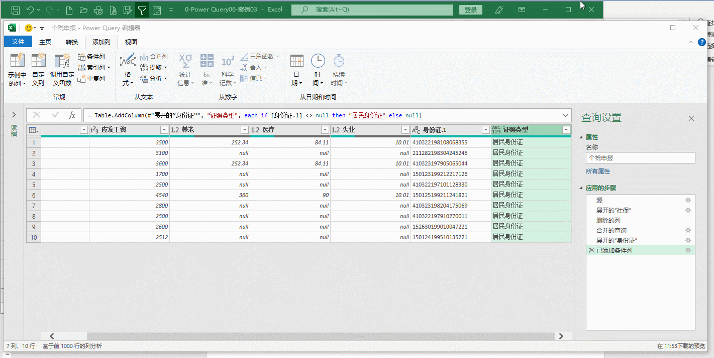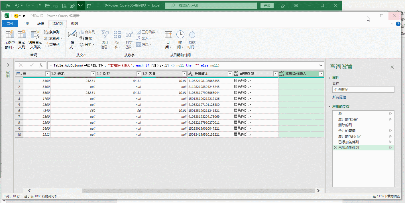 点击“添加列”下面的“条件列”,弹出的对话框,“新列名”录入“本期免税收入”,列名选择“身份证.1”列,运算符选择“不等于”,值输入“null”,一般我们都没有免税收入,输出空白即可,确定,动图七。