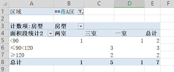 上篇分享了数据透视表对数据单一属性的分析,实际运用过程中经常会遇到需要对数据的多个属性进行交叉分析的情况。例如:需要统计出下表中**市各区的各种房型各面积段的房屋各有多少套。