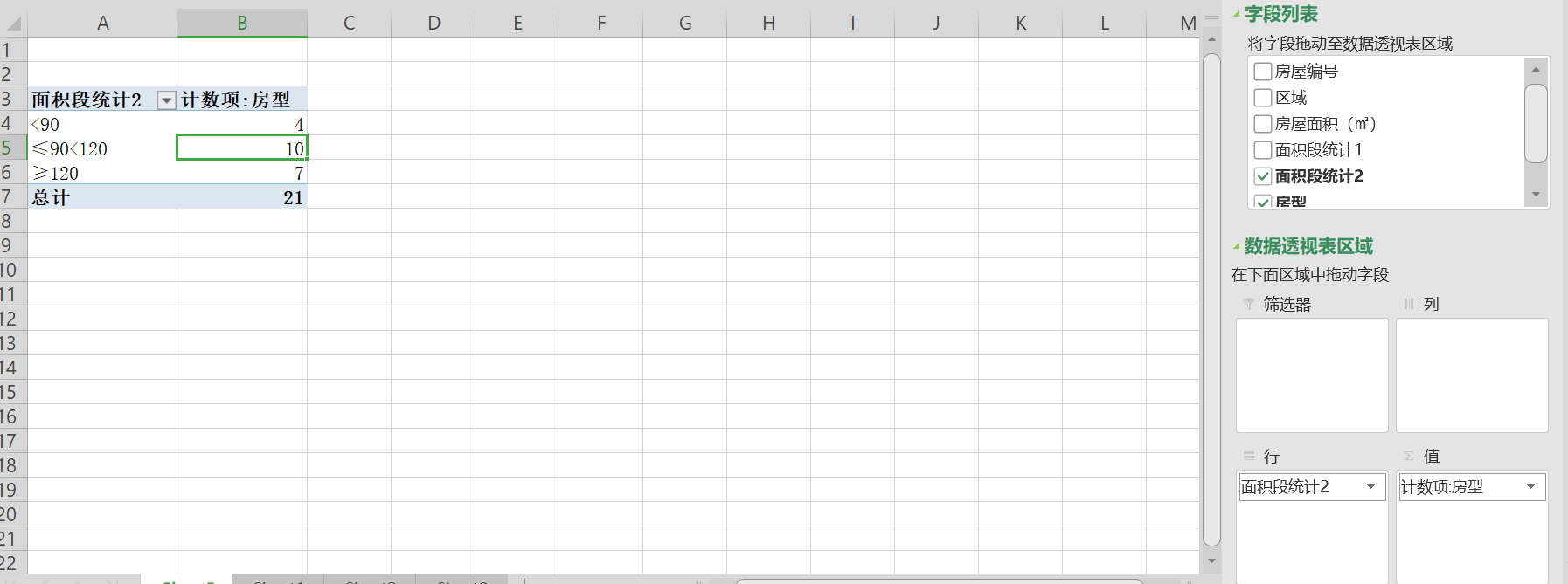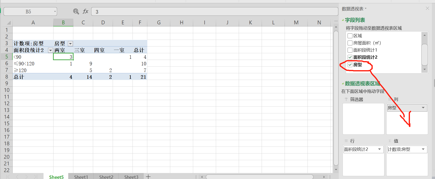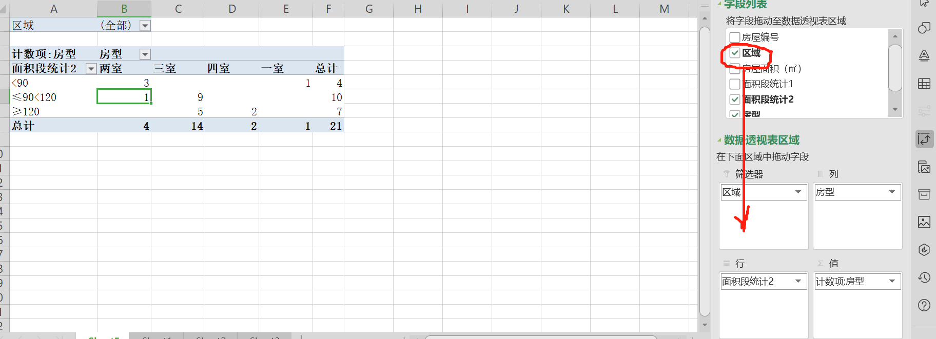 第二步:将“房型”拖曳至“列”下面的空白处,可以得到各房型各面积段的套数。