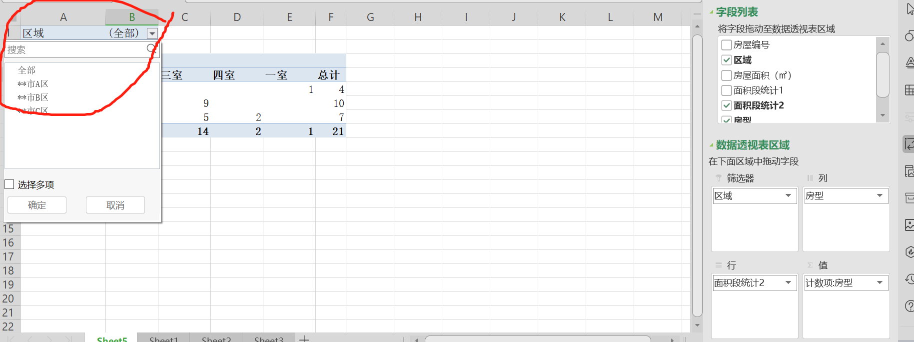 第四步:选择数据透视表上部“区域”右侧的下拉三角符号,分别选择各个区域,就可以得到每个区域的相应数据。建议每选择一个区域,就将得到的数据复制到一个专门的表格,依次操作后就可以得到各个区域的情况。