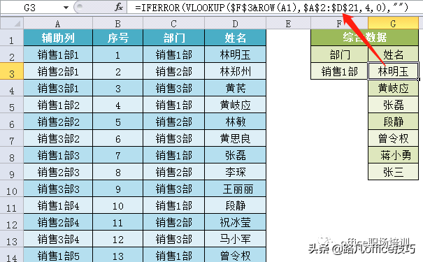 VLOOKUP函数第1个参数使用F3&ROW(1:1),表示销售1部1,向下填充,就是查找销售1部2,销售1部3....